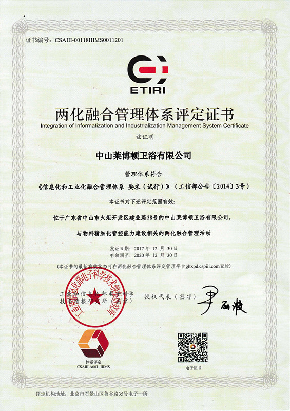 兩化融合管理體系評(píng)定證書(shū)