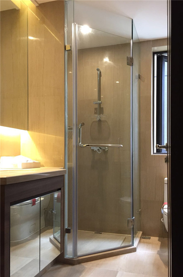 鉆石型淋浴房的非標(biāo)定制,充分利用衛(wèi)浴間的一角,采用無框設(shè)計(jì),營造出一個(gè)獨(dú)立、舒適的淋浴空間。外側(cè)拉手采用實(shí)用的一字型拉手,可以掛毛巾、衣服等物品。